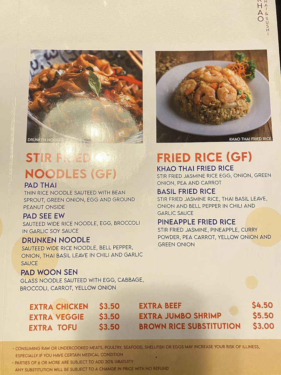 Sauteed wide rice noodle, bell pepper, onion, Thai basil leaves in chili and garlic sauce.